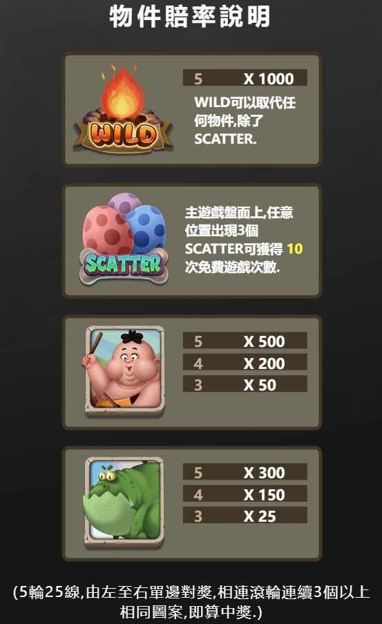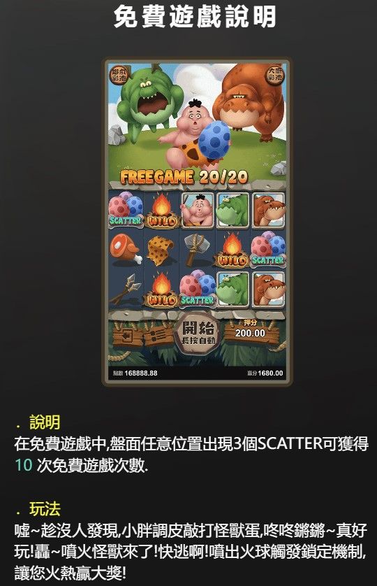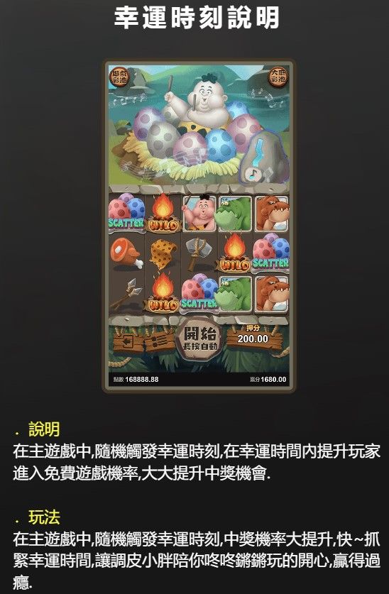 《原始蛋疼人》是一款以神秘原始時代為背景的電子遊戲,遊戲將玩家帶入一個充滿未知與挑戰的原始叢林世界,融合了解謎、冒險與高額獎勵的多元元素,讓人欲罷不能。玩家將扮演主角「小胖」,一個勇敢又略帶搞笑的冒險者,穿越危機四伏的叢林,探索隱藏在怪獸蛋中的秘密寶藏。遊戲採用經典的五軸25線設計,並加入免費旋轉與WILD鎖定等特殊機制,讓玩家在輕鬆有趣的遊戲過程中,感受到緊張刺激的高額獎金衝擊。無論你是新手還是老玩家,這款遊戲都能帶來獨特的娛樂體驗,同時挑戰你的智慧與運氣,讓每一次旋轉都充滿期待與驚喜。
